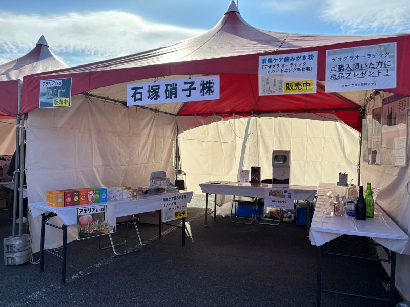 例年に引き続き、ガラス食器やデオグラオーラテック(歯磨き粉)の販売、当社事業紹介パネルや製品展示などを行いました。