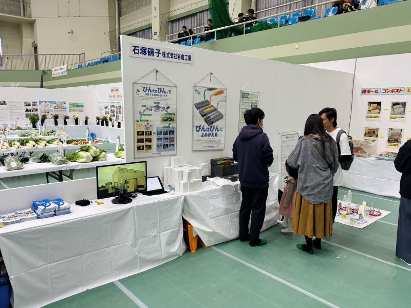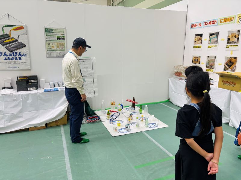 環境コーナーでは、ガラスびんのリサイクル啓発や、ガラス原料への卵殻利用、プリフォーム事業の紹介などを行いました。